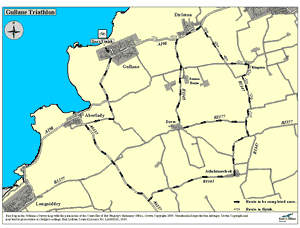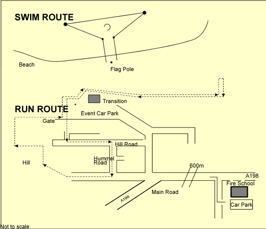 The swim course will be a long lane out to the main triangle; the swim direction may depend on the wind direction and sea state on the day. There will be large buoys marking the course. Swimmers follow the lane, then follow the course as marked swimming back to the lane to return to the shore. Once on shore Standard competitors will run round a flagpole and return to the water for a second lap. Canoes will be stationed at each turning buoy. There is no lead canoe! On leaving the water, competitors will run up a tarmac path from the beach to the transition area. Water temperature is expected to be around 13° C. Wet suits are compulsory (hire is available from Bicycleworks). If any swimmer does experience problems they should turn onto their back and raise an arm to signal for assistance. Safety boats will be able to access all sides of the triangle without having to cross the path of any swimmers. The Coastguard will operate from the shore. Medical assistance will be available on the shore. Please note that a cut off time of 25 MINUTES will be strictly administered, any swimmer not making the end of one lap in that time will be asked to stop. It is important for the safety of all competitors that this cut off time is respected. The sea state will be closely monitored with the Coastguard, Police and RNLI. In the event of a heavy swell or very poor visibility, the swim will be canceled with the race then become a duathlon. RUN: The run route is a two-lap course for Standard competitors and one-lap for Sprint competitors. Competitors leave the transition area by the marked exit and will be directed by marshals along the car park road (marked *) and up a grassy lane towards Hill Road. Turn left onto Hill Road, right into Hummel Road and then right again at the end of Hummel Road. On reaching a gate, which will be marshaled, turn immediately right up a steady grassy climb. From here, the route follows an off-road section that will be clearly marked by tape and marshaled. Rejoin the car park road by-passing the transition area. The course then follows a flat out and back section before returning to the transition area. Standard competitors then bypass the finish chute to complete a second lap. One drinks station will be provided at the transition area for the swim to bike and then at 1 lap for the run. |
